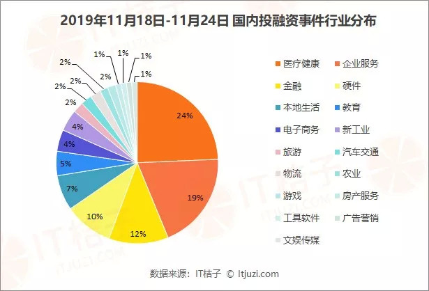 从行业分布来看,医疗健康以 45 起成为上周国内外发生融资并购事件最多的行业,占比 24%;企业服务排列第二,发生 36 起融资并购事件,占比约 19%;金融行业排列第三,发生 22 起融资并购事件,占比 12%。