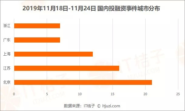 从区域分布来看,北京依然是国内当之无愧的「创投活跃地」,上周共发生 21 起;江苏位居第二,发生 16 起;上海居第三,发生 12 起。