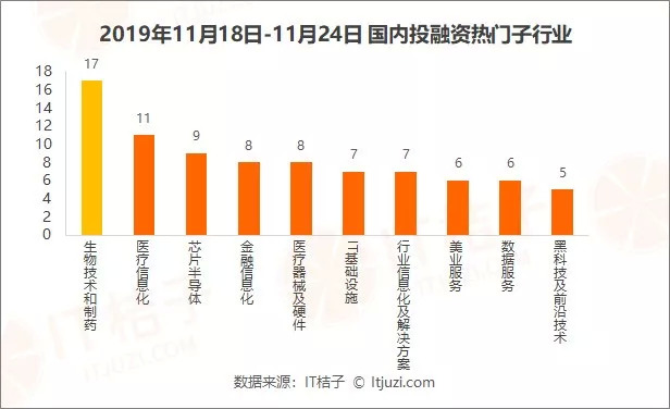 上周最受投资人追捧的子行业分别是生物技术和制药、医疗信息化、芯片半导体、金融信息化、医疗器械及硬件、IT基础设施、行业信息化解决方案、美业服务、数据服务、黑科技及前沿技术。