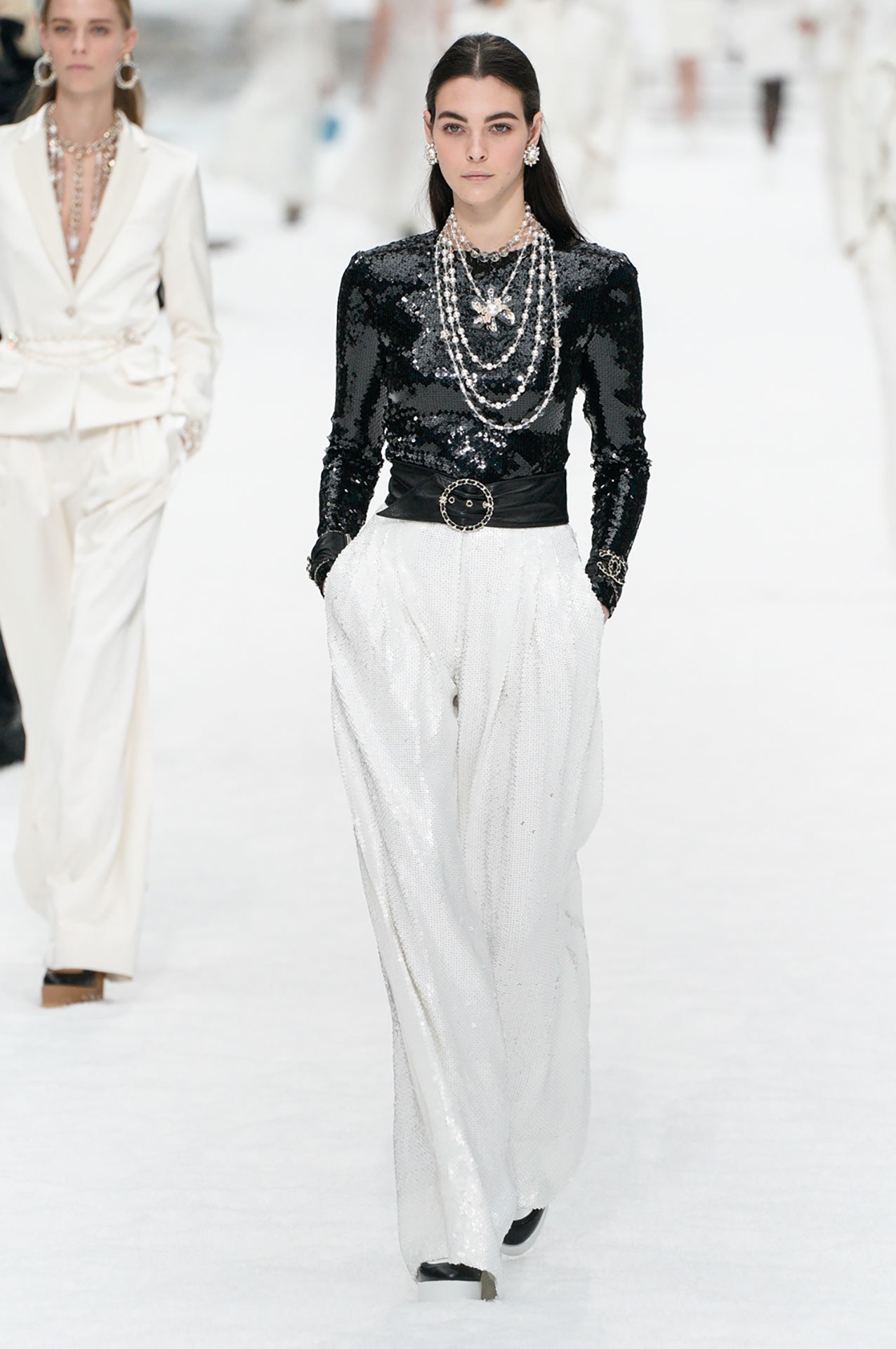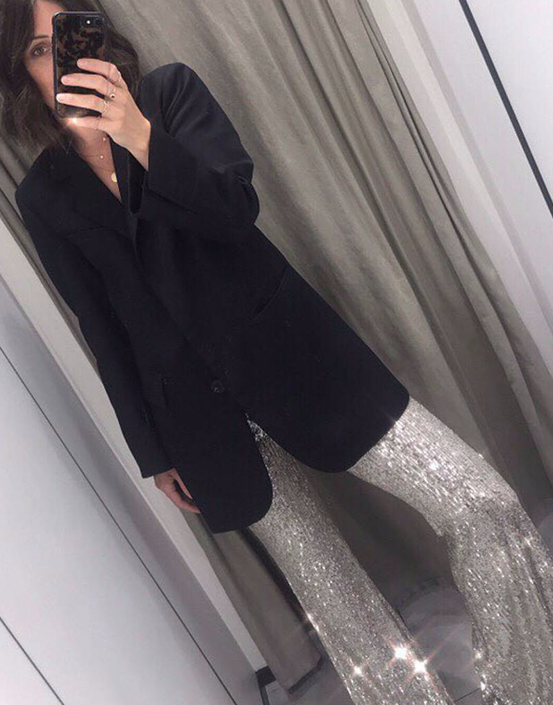 如果厚重的大衣里能若影若现地看到闪烁的亮片,抓眼球的效果有多好无需多说。当进入室内,脱下外套,亮片小外套及西装在保证温度的同时,也是风度的象征。值得提到的是,不管是休闲装还是职业通勤打扮,一件亮片外套都可以中和风格,让整体穿搭的时髦度瞬间提升。