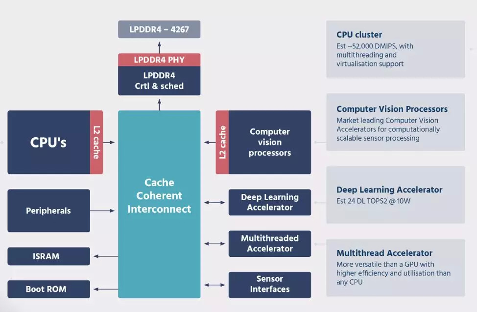 其中CVP是ME的核心卖点算法,有自己的ASIC电路来达到低功耗高效率。这也是车厂和Tier1的供应商完全看不见的秘密黑盒。从ME深度学习加速器的小比例可以看到,其芯片还是以视觉处理为主,深度学习只是辅助。