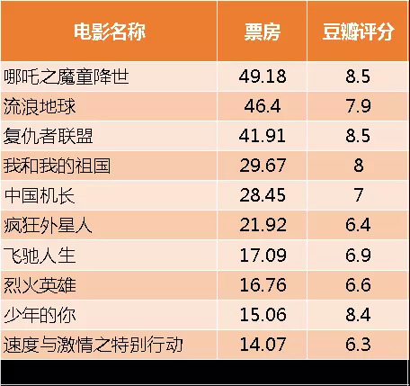 2019年票房成绩前十的电影,8分以上作品有四部,分别为《哪吒之魔童降世》8.5分,《复仇者联盟4》8.5分,《少年的你》8.4分,《我的我的祖国》8分。豆瓣评分6分~7分间的作品三部,为票房成绩第五名~第七名的《疯狂外星人》《飞驰人生》和《烈火英雄》,其豆瓣评分分别为6.4分、6.9和6.6分。