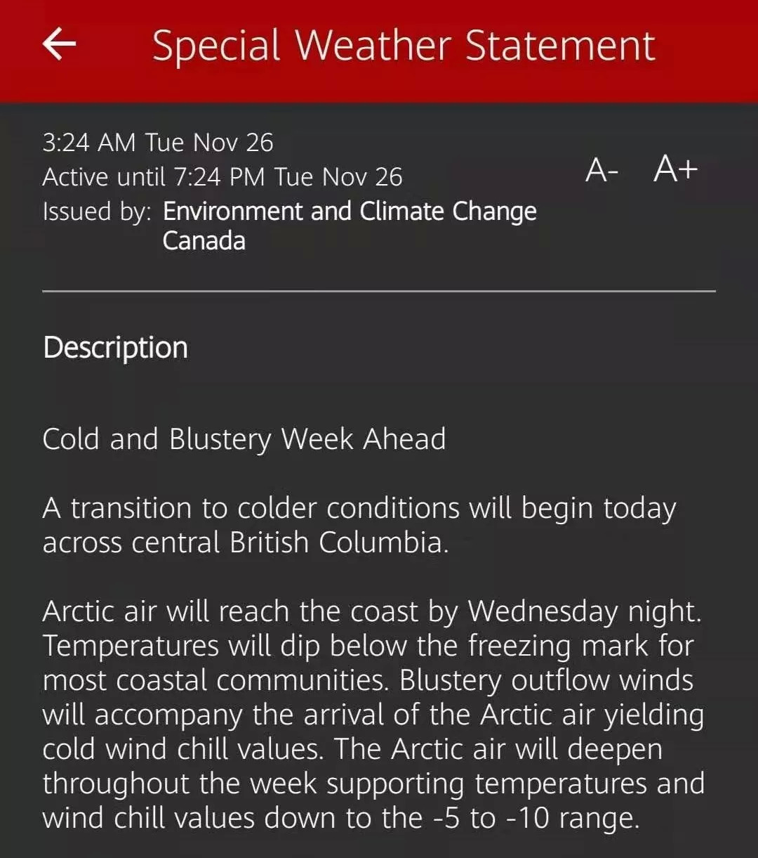 大温本周将会非常冷。冷到什么程度呢?据加拿大环境部11月26日(周二)凌晨发布极地寒流预警,从本周三晚上开始,气温将会骤降至零下5度,加上风冻效应,实际温度将达到零下10度,内陆地区甚至降至零下25度!