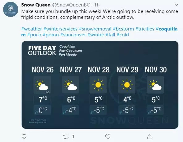 环境部预计本次受冷锋影响地区包括温哥华、本拿比、北岸、高贵林、枫树岭、素里、兰里、列治文和三角州。