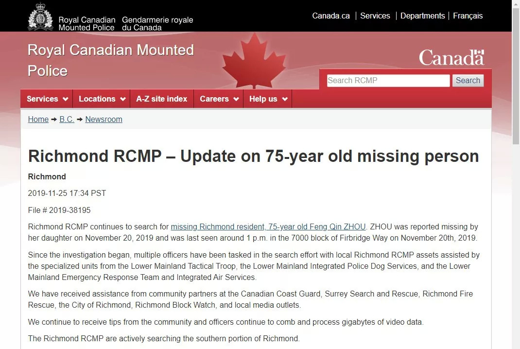 根据皇家骑警的证实,最后一次目击到老人的地点仍是7000 Firbridge Way梅园餐厅附近。自从周奶奶失踪后,低陆平原战术部队、警犬队、综合航空服务部门、内地紧急响应小组等多个部门已经联手RCMP展开了地毯式搜索。目前警方的搜索主要集中在列治文南部地区。