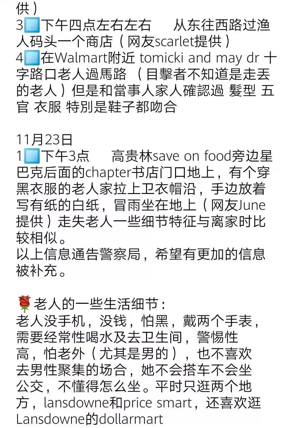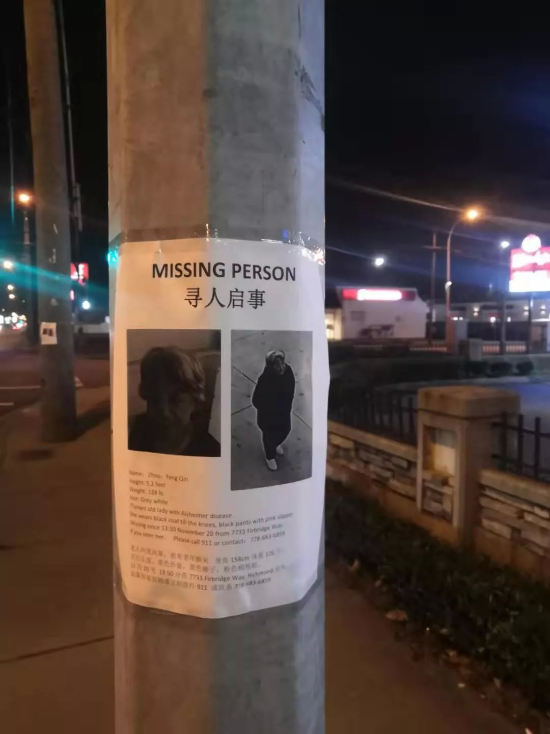 目前大温本地众多市民已经参与到志愿寻找周奶奶的队伍中,列治文3号路沿线随处可见寻人启事。