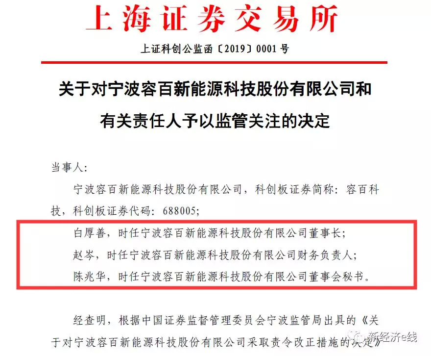 新经济e线注意到,在文号为“上证科创公监函〔2019〕0001号”的这份监管函中,上交所明确表示,在信息披露和规范运作方面,公司有关责任人在职责履行方面存在违规行为。