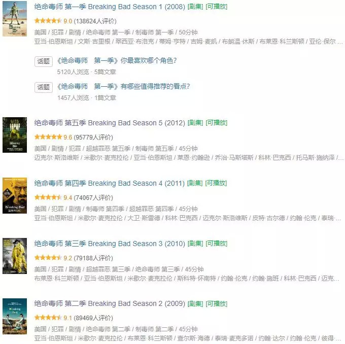 自从2008年推出第一季,《绝命毒师》每一季的评分都维持在9.0以上的高水准,第五季的豆瓣评分更是达到了9.6的高分。
