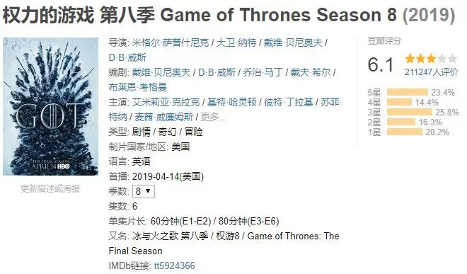 没有了原著小说的支撑之后,编剧彻底放飞自我,把权游从原先9.0以上的评分在第八季直接拉到了6.1分。