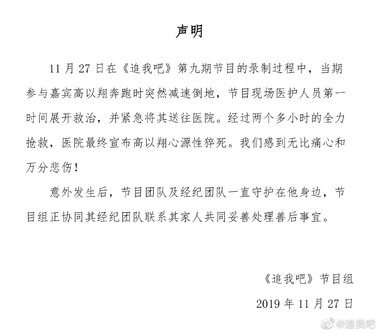 12时23分,《追我吧》节目官方微博发布《声明》称,11月27日在《追我吧》第九期节目的录制过程中,当期参与嘉宾高以翔奔跑时突然减速倒地,节目现场医护人员第一时间展开救治,并紧急将其送往医院。经过两个多小时的全力抢救,医院最终宣布高以翔心源性猝死。节目组正协同其经纪团队联系其家人共同妥善处理善后事宜。