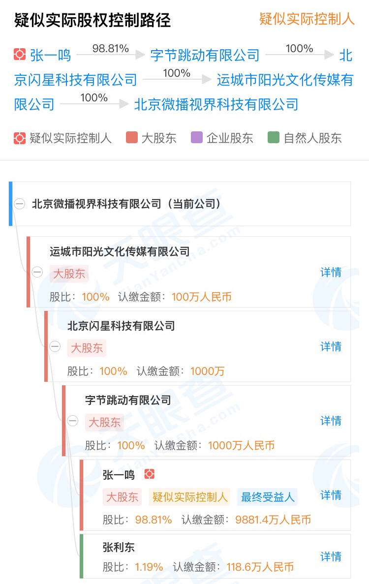 抖音所属公司是北京微播视界科技有限公司,成立于2016年3月11日,注册资本100万元人民币,由字节跳动有限公司间接持股100%。