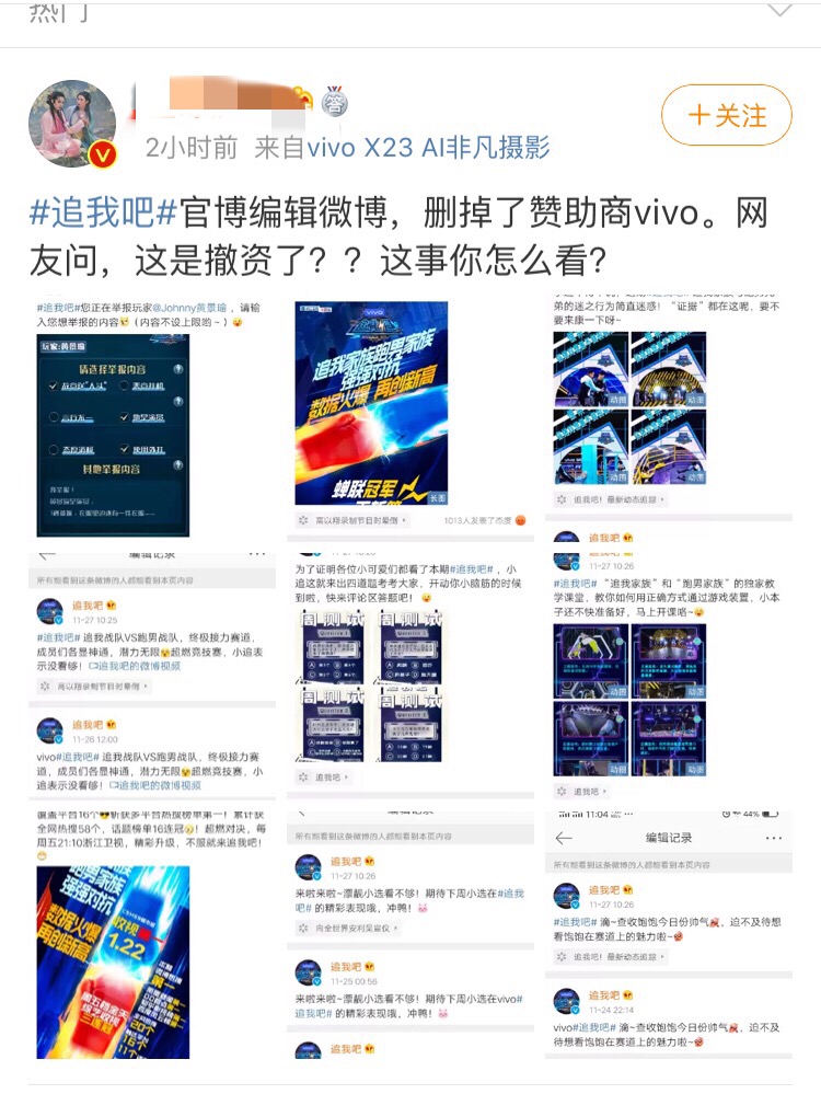 在《追我吧》上述声明发布前一个小时,有知名博主新浪加V认证用户注意到,官博第一时间编辑微博,删掉了赞助商vivo。这一举动亦引起网友热议。