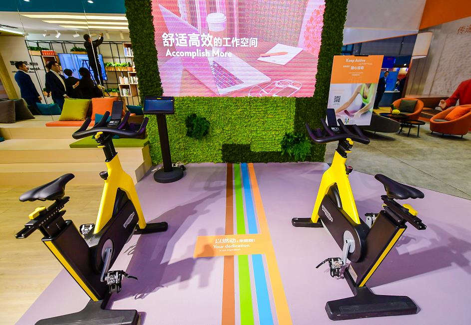 界面新闻记者在展会现场看到,逸衡酒店不仅拥有专业、设备齐全的健身房,而且还将瑜伽垫、健身球等运动设备融入到酒店大堂及客房设计中。