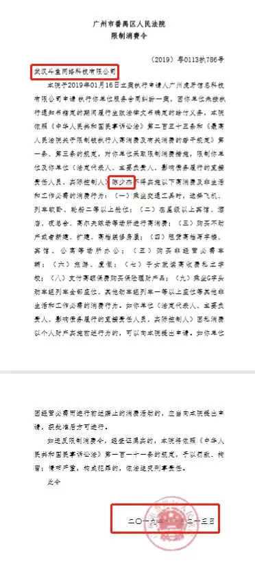 今年11月23日,广州市番禺区人民法院发布消息称,因斗鱼未按执行通知书指定的期间履行生效法律文书确定的给付义务,属于有履行能力而拒不履行生效法律文书确定义务,将斗鱼列为失信被执行人。同时,法院限制斗鱼及其主要负责人陈少杰高消费,不得乘坐飞机、列车软卧、轮船二等以上舱位;不得在星级以上宾馆、酒店、夜总会、高尔夫球场等场所进行高消费……