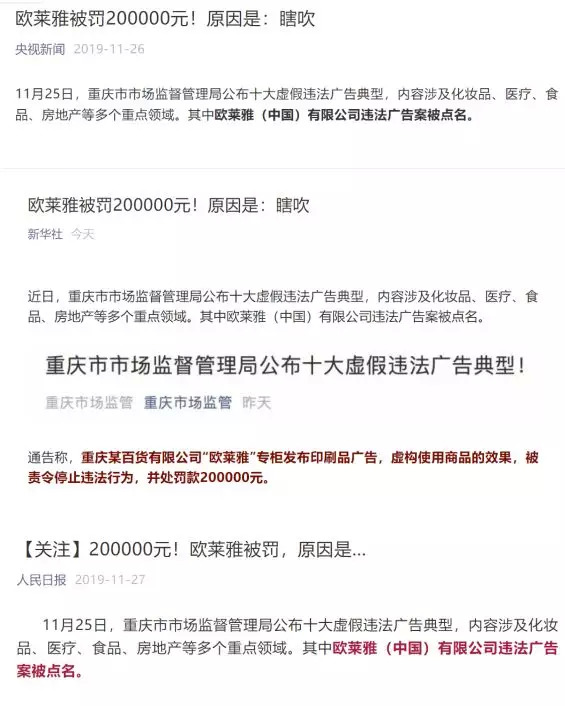 11月25日,重庆市市场监督管理局公布了十大虚假违法广告典型,其中重庆某百货公司“欧莱雅”专柜发布的关于碧欧泉产品的印刷广告,因违反广告法规定,被有关部门责令罚款20万元。该事件也相继被央视、新华社、人民日报等媒体曝光。