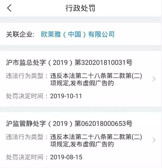 此次事件也并非是欧莱雅首次因虚假广告而被罚。企查查显示,今年8月,上海市静安区市场监管局发布沪监管静处字(2019)第062018000653号,指巴黎欧莱雅官网宣传欧莱雅金致臻颜奢养紧妍精华液30ml时出现“对抗色斑”“使黯沉斑点变淡”的字样,违反《广告法》第二十八条第二款第(二)项规定发布虚假广告,处以罚款20.5970万元,并责令停止发布的行政处罚。10月,上海市市场监督管理局也作出沪市监总处字(2019)第320201810031号决定书,指出欧莱雅在上海东方卫视发布的新精华肌底液产品电视广告中突出展示的“肌肤光泽度 +38%”的产品功效,对消费者的购买行为有实质性影响。其行为违反《广告法》第二十八条第二款第(二)项规定,发布虚假广告。
