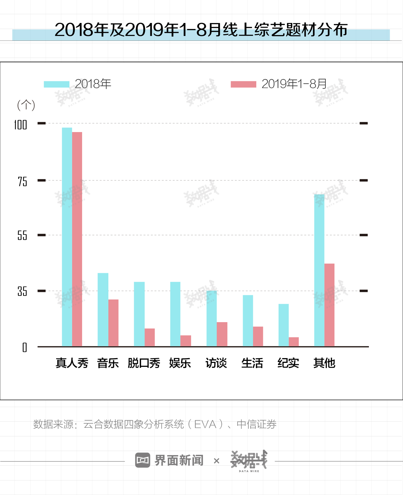 为了在综艺大战中取胜,各个卫视、视频平台不断翻新花样。从音乐到脱口秀,从真人竞技到生活观察,各类综艺层出不穷。总体来说,还是真人秀类型的最多。云合数据显示,2018年线上综艺题材中真人秀占比最高、达30.25%。今年1-8月,真人秀类型在线上综艺的占比更是高达50.26%。本次高以翔参加的《追我吧》,也是一款真人秀综艺。