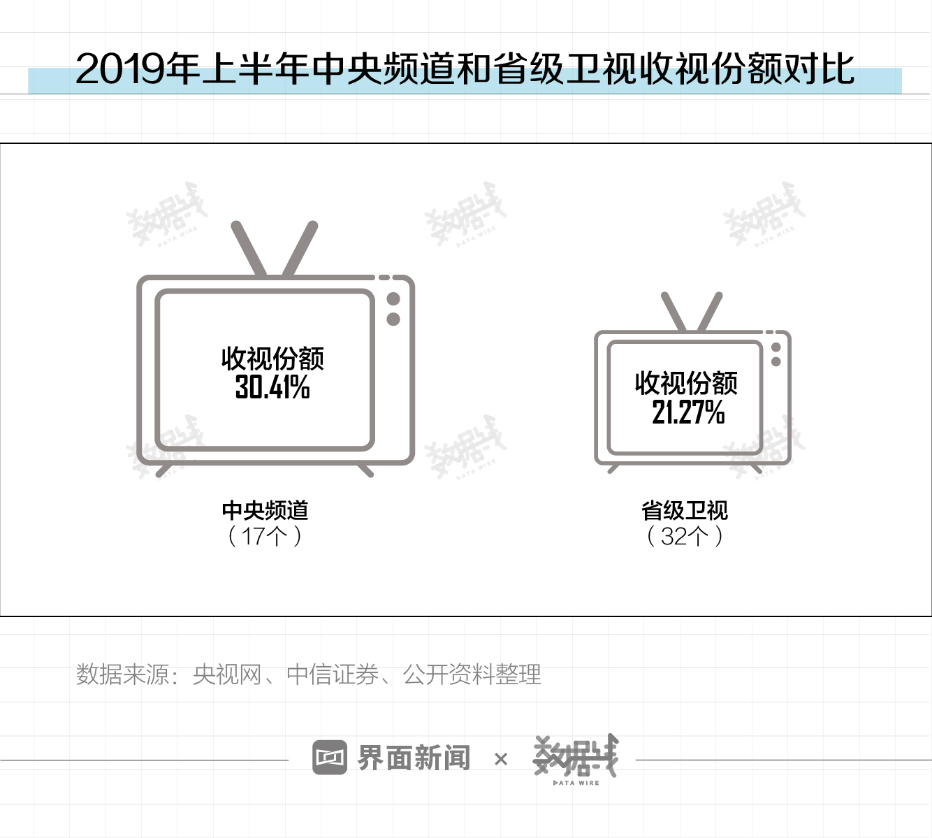 地方卫视越来越拼,不仅仅因为身后有网生综艺在追赶,他们前面还有央视“堵截”。从频道收视率来看,在电视端中央频道的收视份额最高。据央视网和中信证券数据,2019年上半年17个中央频道的收视份额达30.41%,高于32个省级卫视的21.27%。相应地,央视制作播出的综艺节目,也会占据较高的收视份额。