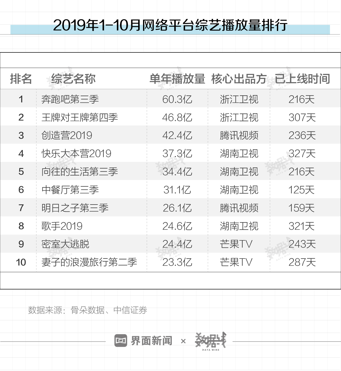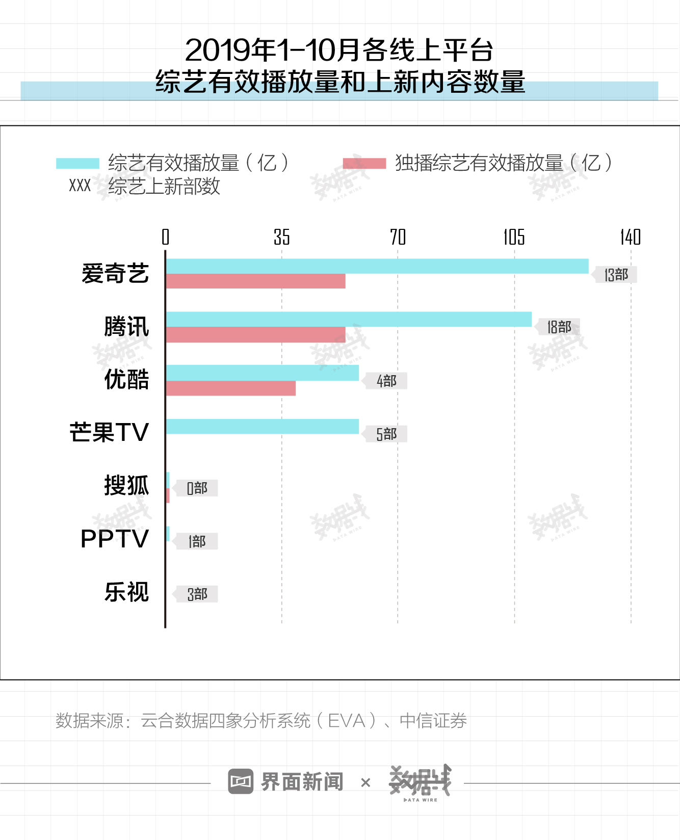 各大卫视的综艺大战,近年来战场已经从电视端延伸到互联网,大家纷纷将综艺节目推上网络视频平台。据云合数据和中信证券数据,2019年1-10月,爱奇艺和腾讯的综艺有效播放量排名前两位,分别达127亿和110亿。优酷和芒果TV分列三、四位。