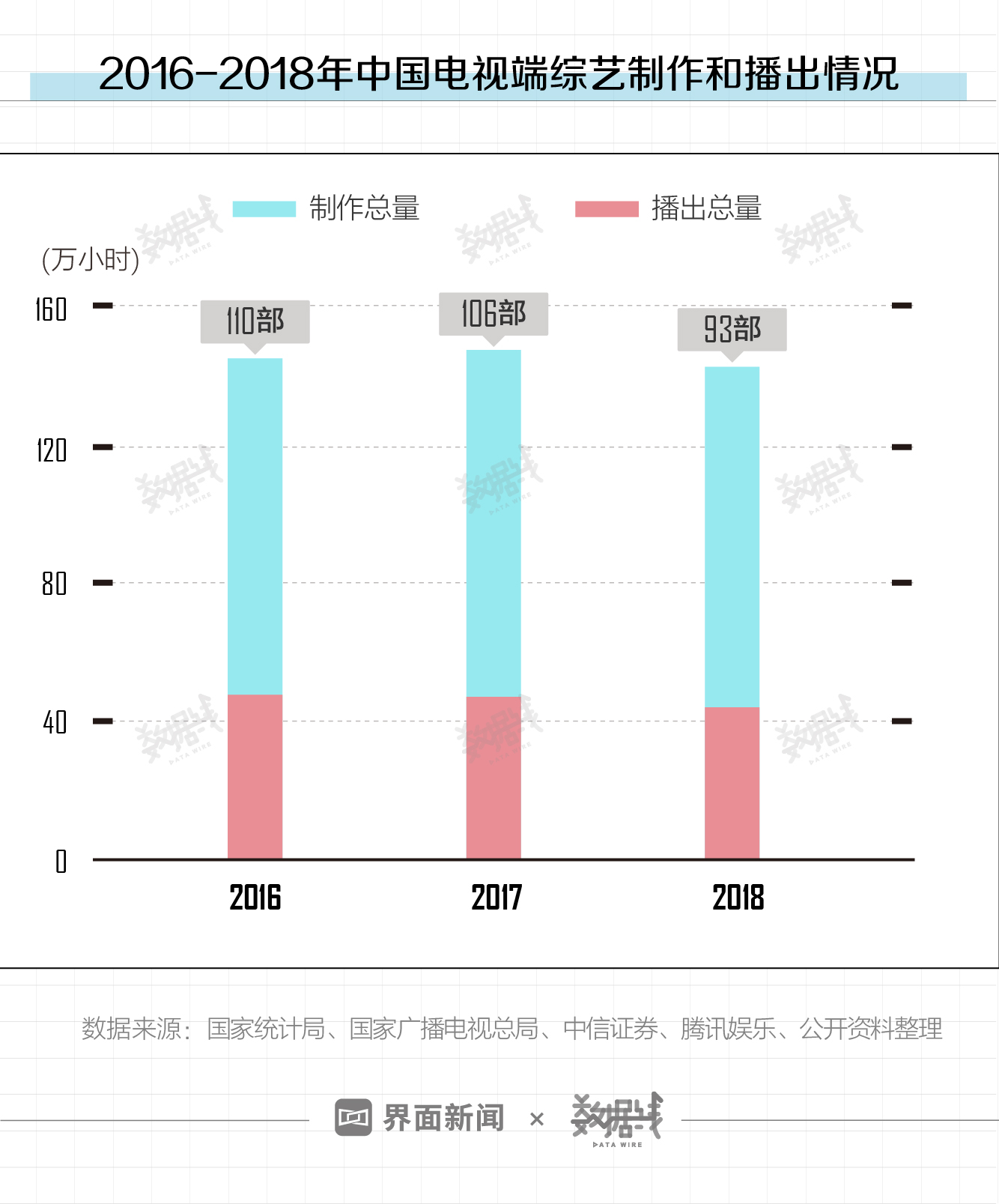 公开资料显示,近年来,全国电视端综艺产量和播放量保持稳定。虽然产量从2016年的110部减少到93部,但电视端的播出总时长变化不大,2016-2018年间的播出制作比不降反升。