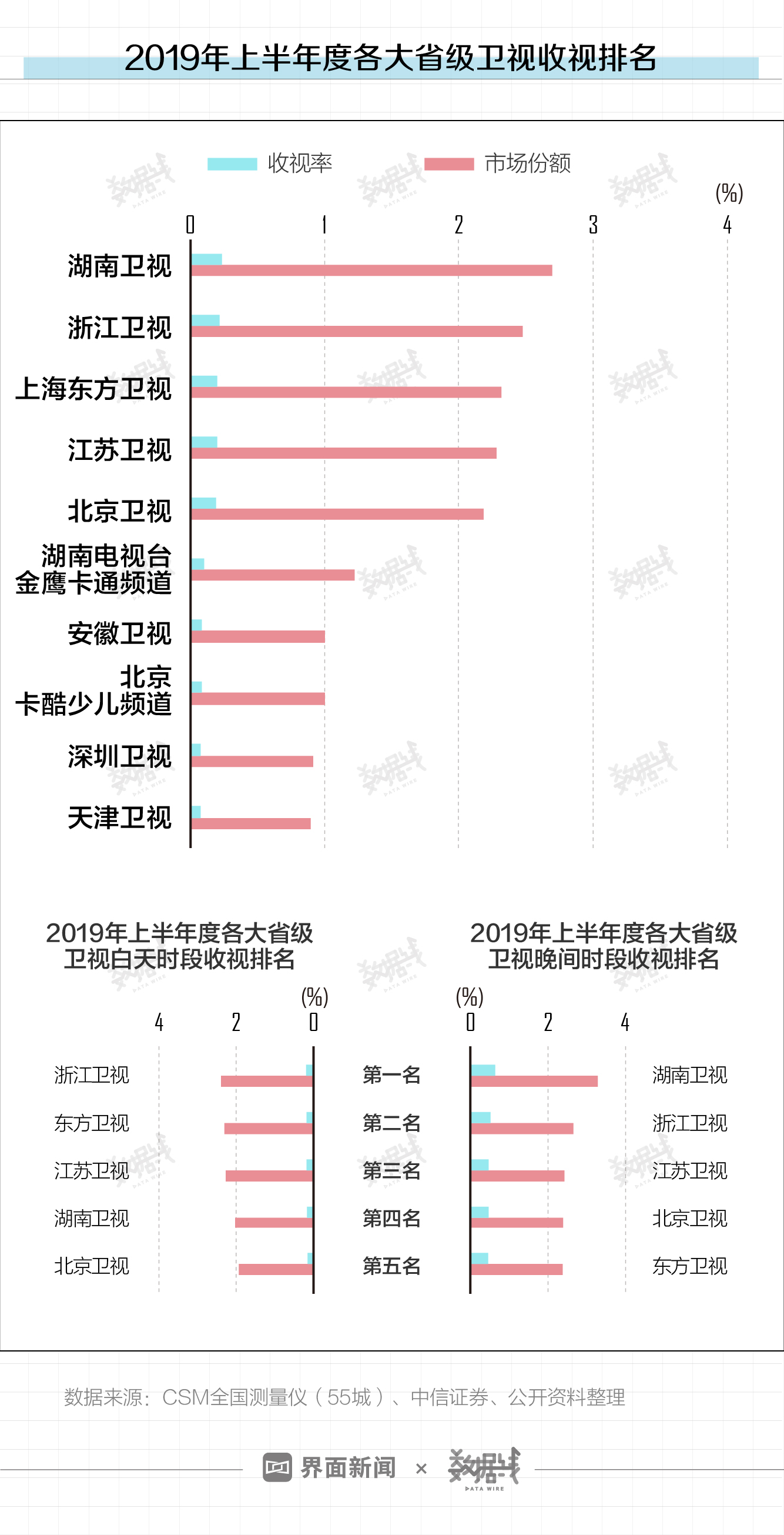 地方卫视层面,CSM全国测量仪(55城)数据显示,2019年上半年湖南卫视收视率最高、市场份额达2.7%,浙江卫视、东方卫视、江苏卫视和北京卫视分列二至四位。分时段来看,白天浙江卫视的收视率最高,晚间则是湖南卫视看得人最多。
