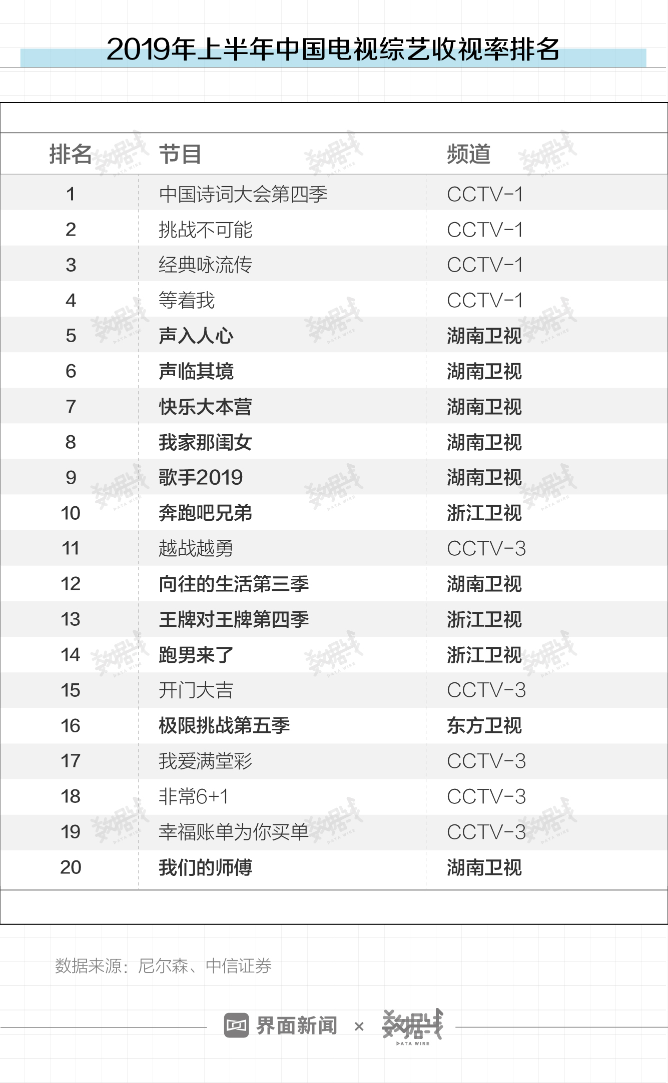 具体到节目层面,尼尔森和中信证券数据显示,2019年上半年中国电视综艺收视率排名前四名均为央视的综艺节目,《中国诗词大会第四季》排名第一。地方卫视方面,前二十名中湖南卫视上榜最多,有5部综艺进入前十名,排名最高的是第五位的《声入人心》。此外,前二十名中浙江卫视有三部入选,东方卫视有一部。