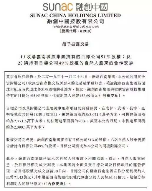 11月27日下午,融创中国宣布,融创西南集团收购云南城投集团持有的环球世纪(成都环球世纪会展旅游有限公司)51%的股权与时代环球(成都时代环球实业有限公司)51%的股权,两个项目的交易对价为152.69亿元。