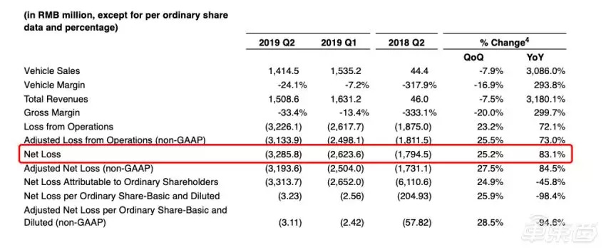 根据蔚来财报,一季度销量同比腰斩50%至3989台,亏损同比大增71%至26.2亿元;二季度受ES8自燃召回事件影响、亏损继续扩大至32.85亿。