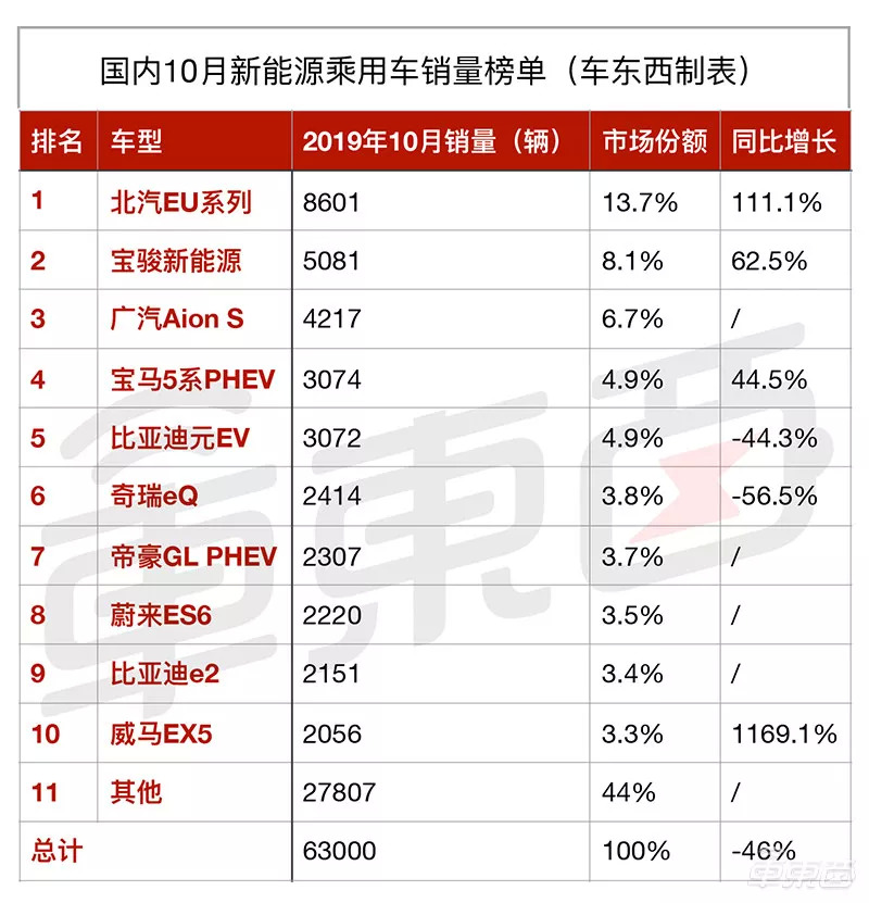 ▲2019年国内10月新能源乘用车销量榜单