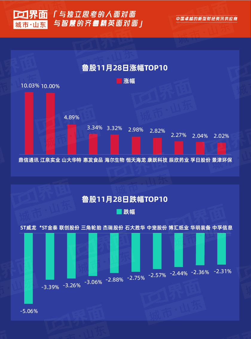 受大盘影响,11月28日山东省内沪深股票有64只个股上涨,131只下跌,14只与上一个交易日收盘价持平;鼎信通讯(603421)涨幅10.3%、江泉实业(600212)涨幅10%,分列沪深主板第4、第8位,双涨停领跑山东板块。