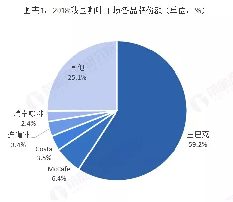前瞻产业研究院发布的2018年度我国咖啡市场各品牌份额数据显示,星巴克以59.2%的绝对优势占据头部。其次是McCafe占比达6.4%,Costa占比3.5%;连咖啡占比3.4%,势头甚猛的瑞幸咖啡占比2.4%。