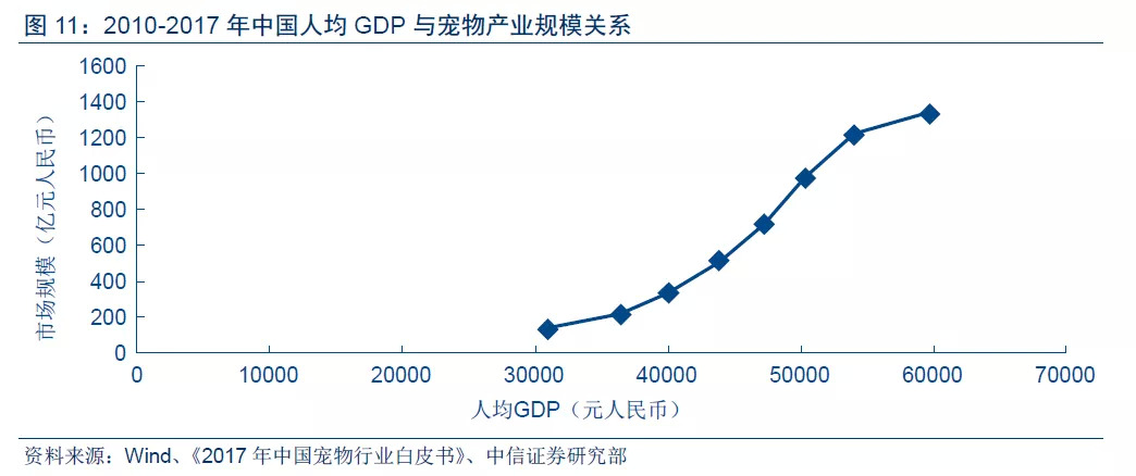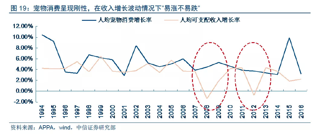 根据美国人均收入和宠物消费支出的增长趋势来看,宠物消费具有刚性特征:即使人均可支配收入增速下滑,人均宠物消费仍未受太大影响,始终保持稳定增长的态势。这是人们对宠物的情感依附度越来越高的缘故。