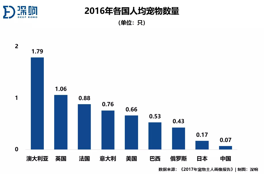 《2017年宠物主人画像报告》中数据显示,2016年我国宠物总量较大,已超过1亿只。但考虑到我国的人口基数,人均宠物数量在全球仍处于较低水平,平均每人仅0.07只。澳大利亚的人均宠物数高达1.79只,位列世界第一。美国平均每人拥有0.66只宠物,约是我国的十倍。由此而看,我国宠物数量还有巨大的增长空间。