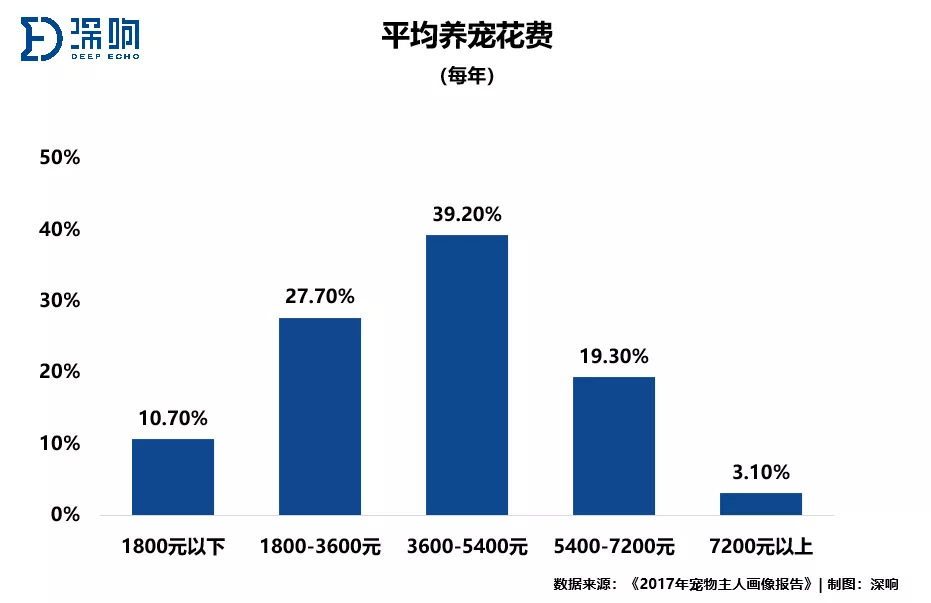 如今,宠物主为爱买单的意愿越来越强烈,为宠物消费绝不手软。《画像报告》数据显示,2017年每年养宠花费超 3600 元的宠物主占比超 60%。