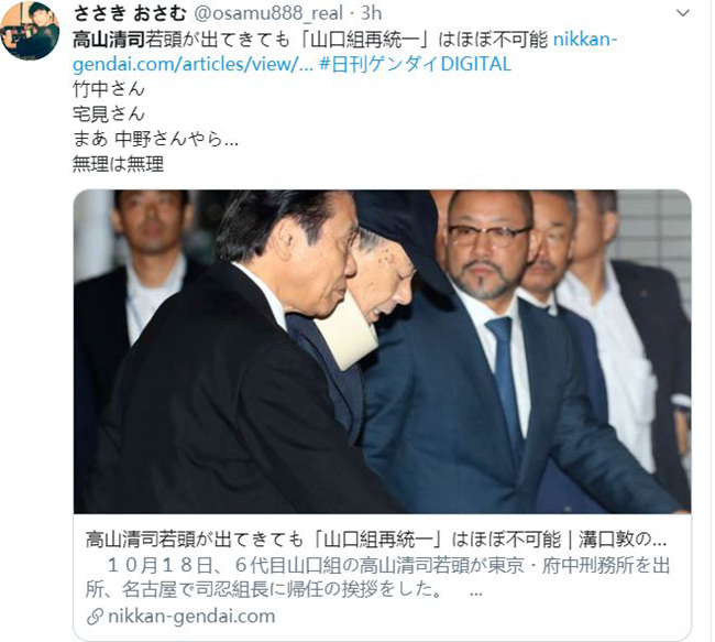 上个月,山口组二号头目高山清司出狱,警方担忧其出狱后将激化山口组的内部对立。此前日本第一大黑帮山口组目前已分裂为山口组、神户山口组和任侠山口组三个组织。
