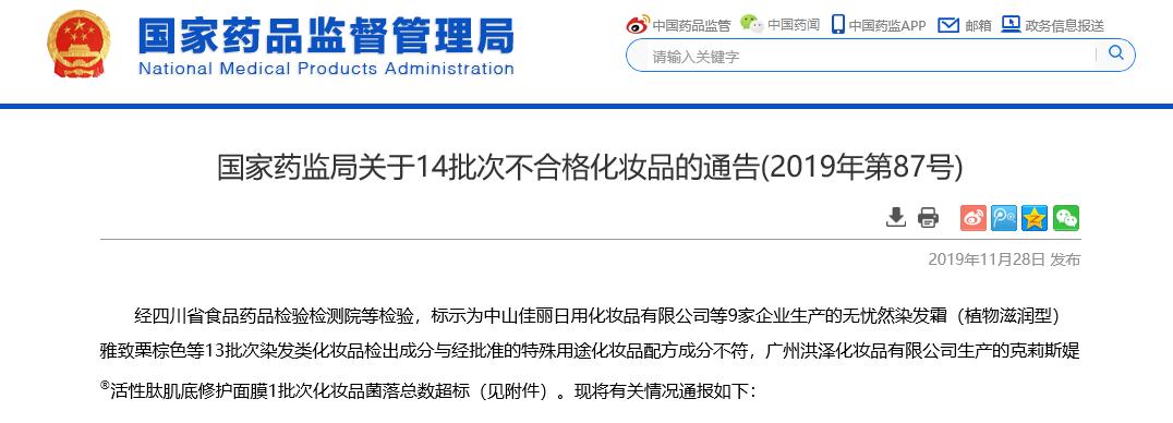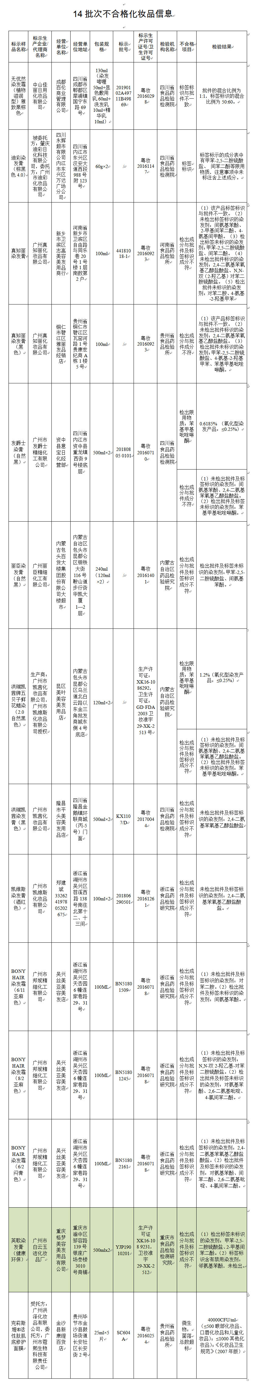 国家药监局发布的通告显示,经四川省食品药品检验检测院等检验,不合格产品为:中山佳丽日用化妆品有限公司生产的无忧然染发霜(植物滋润型)雅致栗棕色;肇庆迪彩日化科技有限公司生产的迪彩染发膏(棕黑色4.0);广州真知丽化妆品有限公司生产的真知丽染发膏、真知丽染发膏(黑色);广州市发爵士精细化工有限公司生产的发爵士染膏(自然黑);广州丽臣精细化工有限公司生产的丽臣染发膏(自然黑);广州市凯茜化妆品有限公司生产的洪瑞凯茜牌五贝子鲜花蜡染(2.0自然黑色)、洪瑞凯茜染发膏(黑色);广州市凯维斯化妆品有限公司生产的凯维斯染发膏(酒红色);广州市邦妮精细化工有限公司生产的BONYHAIR染发霜(6/11亚麻色)、BONYHAIR染发霜(8/2亚麻色)、BONYHAIR染发霜(6/2闷青色);广州市白云玉洁化妆品厂生产的英歌染发膏(健康环保);广州洪泽化妆品有限公司生产的克莉斯媞®活性肽肌底修护面膜。