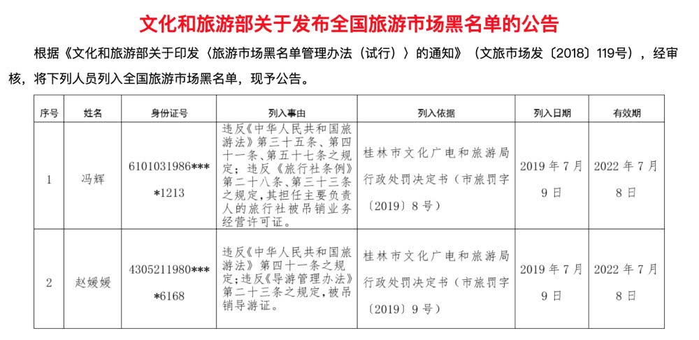 11月28日,文旅部网站发布《关于发布全国旅游市场黑名单的公告》,将冯辉、赵媛媛两人列入全国旅游市场黑名单,有效期为3年。据中新网报道,赵媛媛、冯辉分别是今年6月桂林“导游强制要求游客一小时花两万”事件的涉事导游和涉事旅行社总经理。