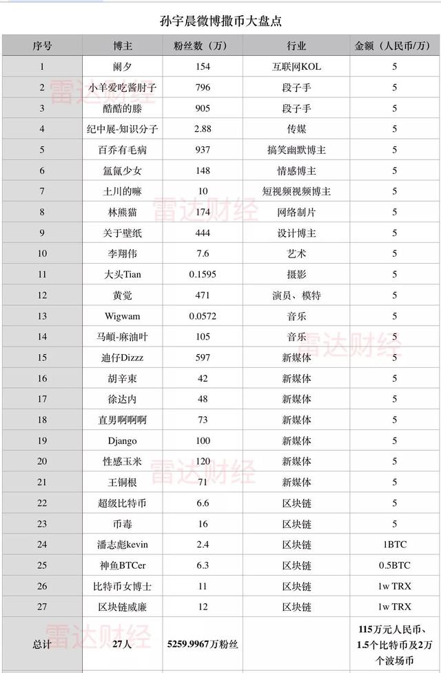 据雷达财经统计,截至发稿,总计有27人收到孙宇晨转账,合计转账金额为115w,另加1.5个比特币和2万波场币。