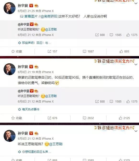 “怼”完王小川后的孙宇晨并没有停下来。此后不久的6月8日,孙宇晨在微博上再次喊话王思聪,连发三条微博称:“靠爹的还敢骂靠自己的,80后还敢骂90后,搞个直播就倒闭的敢骂还在创业的,谁给你的勇气,梁静茹吗?”