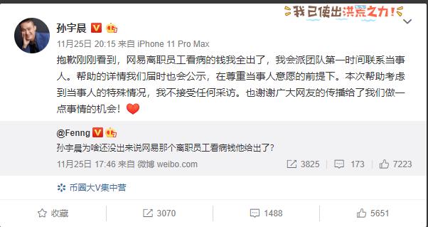 近日,网易曝出辞退绝症员工。孙宇晨再度跟上:“抱歉刚刚看到,网易离职员工看病的钱我全出了,我会派团队第一时间联系当事人。帮助的详情我们届时也会公示,在尊重当事人意愿的前提下。本次帮助考虑到当事人的特殊情况,我不接受任何采访。”