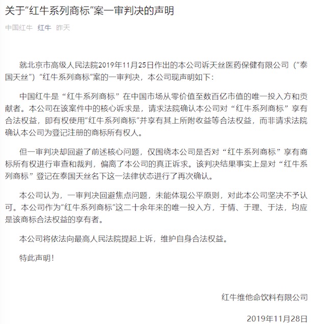 面对北京市高级人民法院的上述判决结果,中国红牛也在11月28日发布了一则声明:称中国红牛是“红牛系列商标”在中国市场从零价值至数百亿市值的唯一投入方和贡献者。中国红牛在该案件中的核心诉求是,请求法院确认本公司对“红牛系列商标”享有合法权益,即有权使用“红牛系列商标”并享有其上所附收益等合法权益,而非请求法院确认本公司为登记注册的商标所有权人。而一审判决却回避了前述核心问题,仅围绕是否对“红牛系列商标”享有商标所有权进行审查和裁判,偏离了公司的真正诉求。未能体现公平原则,“公司坚决不予认可”,将向最高人民法院提起上诉,维护自身合法权益。