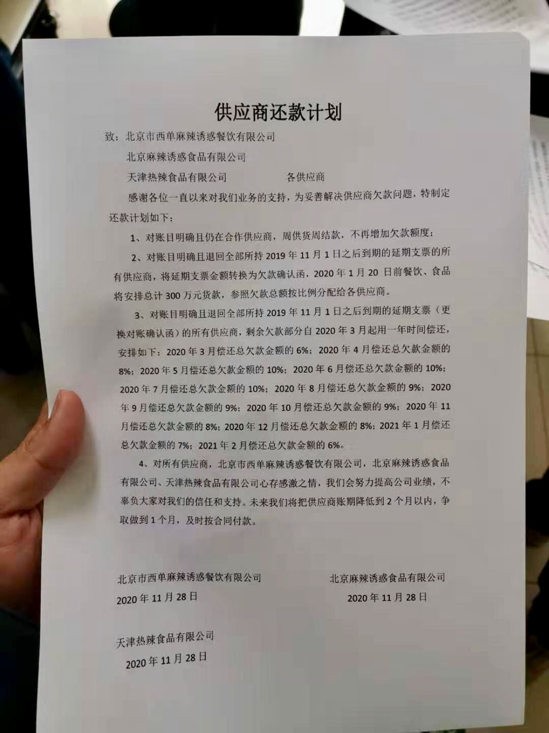 时间走到上午11点19分,徐冰和在场的50多名经销商等到的,是麻辣诱惑餐饮采购总监刘西朋在线发送的一份电子版供应商还款计划。现场工作人员将其打印后分发给了经销商。