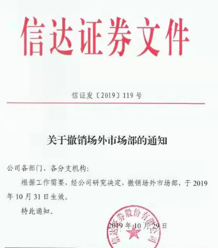 与投行业务相关的是,今年10月末,信达证券还裁撤了主要负责新三板业务的场外市场部。财报数据显示,仅2018年,信达证券就在新三板做市业务投资上损失3800万元,收益率-11.71%。