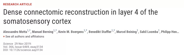 研究人员从小鼠桶状皮质的第4层重建了约500000立方微米的体积,比以前从哺乳动物的大脑皮层进行的密集重建约大300倍。连接组数据能够提取几何信息无法预测的抑制性和兴奋性神经元亚型。研究人员量化了连接组的印迹,其产生了与饱和长期增强作用一致的回路部分的上界。这些数据建立了哺乳动物皮质局部致密神经元回路的连接组表型分析方法。