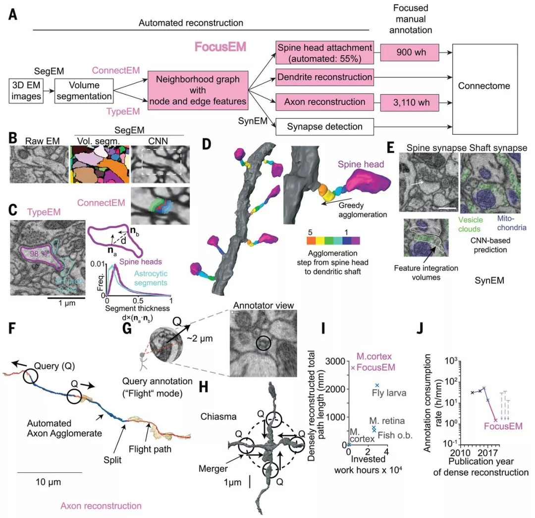 对于密集重建(图1,E到H),研究人员对图像进行3D对齐,并应用了一系列自动分析技术[SegEM, SynEM, ConnectEM和TypeEM],然后,有重点地进行人工注释(FocusEM)。研究人员在数据集中重建了89个神经元(图1、E和F),这些神经元仅占总连接长度的2.6%。