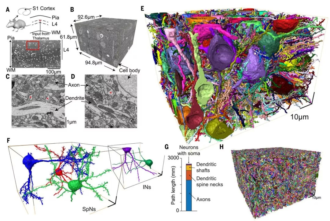 研究人员使用连续扫描电子显微镜(SBEM)从一只28天龄的小鼠的初级体感皮层的第4层(图1, A至D)获得了一个3D EM数据集。