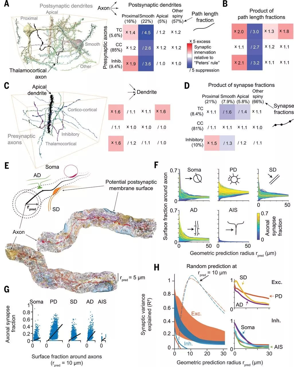 是否可以仅从轴突和树突的几何结构中得出这些局部连接规则呢?研究人员首先量化了轴突和树突的空间分布与它们之间的突触建立之间的整体关系(图5)。