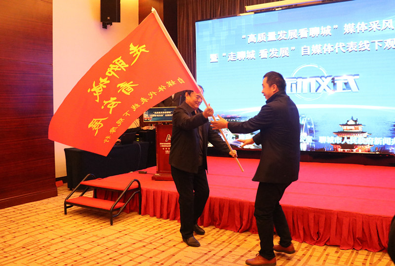 随后,伴随着热烈的掌声,中共聊城市委宣传部副部长、聊城市人民政府新闻办公室主任姚清昌分别为“高质量发展看聊城”媒体采风团、“走聊城 看发展”自媒体代表线下观摩团授旗。