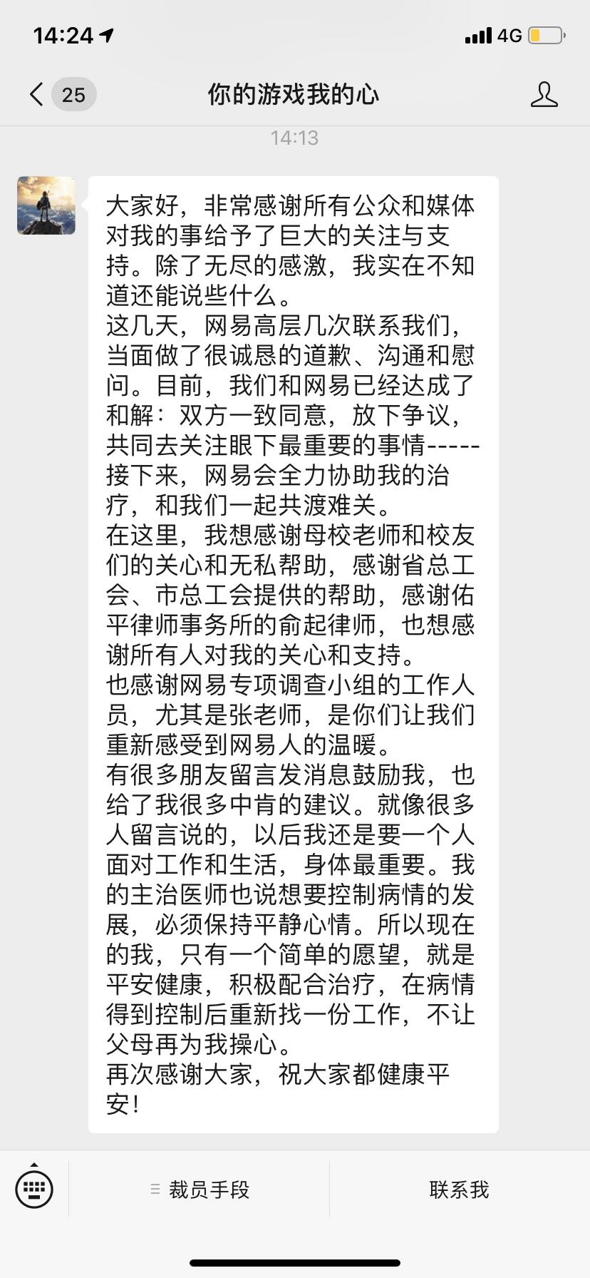 近几日,公司管理层多次与这名同事及其家属联系,当面做了诚挚的道歉和大量的沟通,双方解除了一些误会,目前已达成和解。下一步,公司将尽最大努力,协助这位同事寻求妥善的治疗方案,帮助他渡过难关。