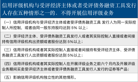 二是机构独立性。信用评级机构与受评经济主体或者受评债务融资工具发行人存在五种情形之一的,不得开展信用评级业务。